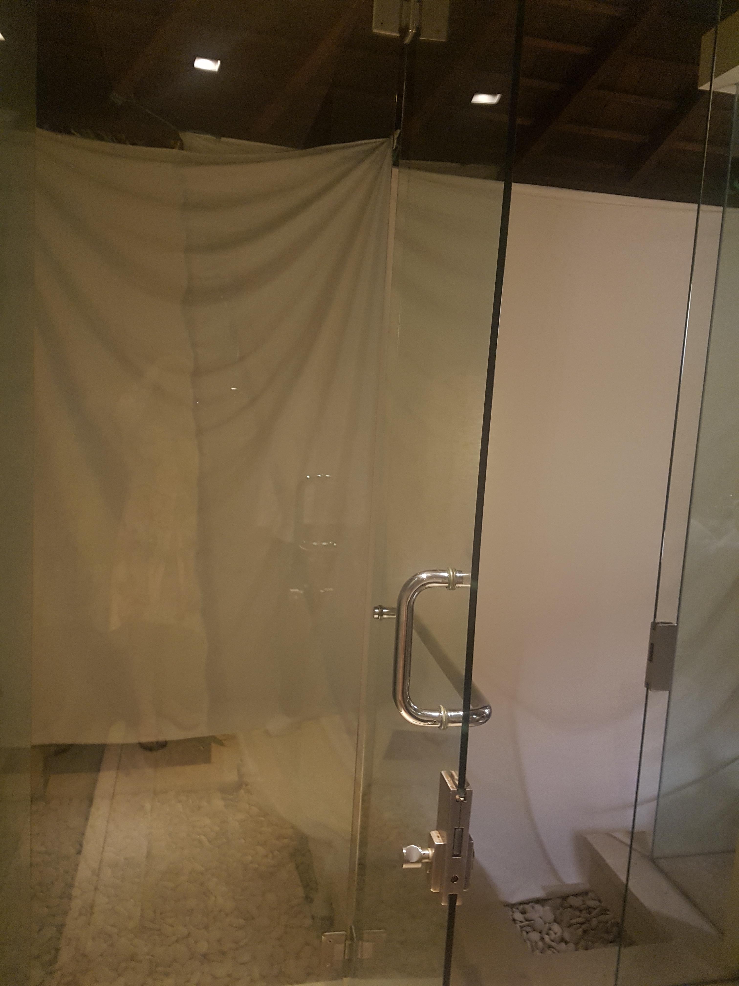 이 이상해 보이는 사진은 사실 감동의 한 컷 사진. 이곳은 샤워실인데 샤워실 문이 불투명이 아니라 통유리로 되어있어 바깥 배경을 감상하며 샤워할 수 있게 만들었고 이 문을 통해서 나가면 야외 샤워실이 나오고 그 옆으로 가면 다시 개별 수영장으로 길이 연결돼 있어요. 근데 문제는 담이 높으면 상관없는데 담이 낮아 건너편 빌라에 키 큰 사람 있다면 보일 수도 있을 것 같은 불안감에.. 꼭 기분이 명동 한복판 투명 유리 부스 안에서 샤워하는 느낌이라 바로 리셉션으로 전화를 걸어 샤워실 문이 투명하게 되어있어서 도저히 민망해서 샤워를 할 수 없다. 안 그런 곳으로 옮겨주던지 아니면 어떤 방법을 써서라도 이 문제를 해결해달라 요청했더니 점심 먹고 온 사이에 통유리로 시원하게 뻥뚤려 있던 곳을 이렇게 샤워실뿐만 아니라 옆에 욕실 통유리까지 전체 다 하얀 이불로 가려주셨더라고요. 꽤 넓었는데 이불 5개는 들어간 것 같아요. 정말 생각지도 못한 기발한 방법에 웃음이 나면서도 그 세심한 배려 가득 서비스에 너무 감동받았어요. 진짜 고객만족도 10점 만점에 10점. 로열 산트리안 정말 최고예요~!! 그 뒤로 저는 더 이상 불안감에 떨지 않고 마음 편하게 샤워를 할 수 있었답니다. 로열 산트리안은 3개의 로열 풀빌라와 나머지는 모두 디럭스 풀빌라로 되어있는데요. 로얄 풀빌라는 해변가 옆에 위치해있기 때문에 가격이 더 비싸고 전용 풀빌라 앞쪽이 정원으로 오픈된 구조이고 디럭스 풀빌라는 사방이 벽으로 둘러싸여 둘만의 조용하고 프라이빗한 시간을 보내기 좋아요. 저는 오픈된 구조.. 지나가는 사람이 우리 집 안, 우리 사생활을 엿볼 수 있다는 건 제게는 너무 끔찍한 일 이어서 디럭스 풀빌라로 예약했어요~