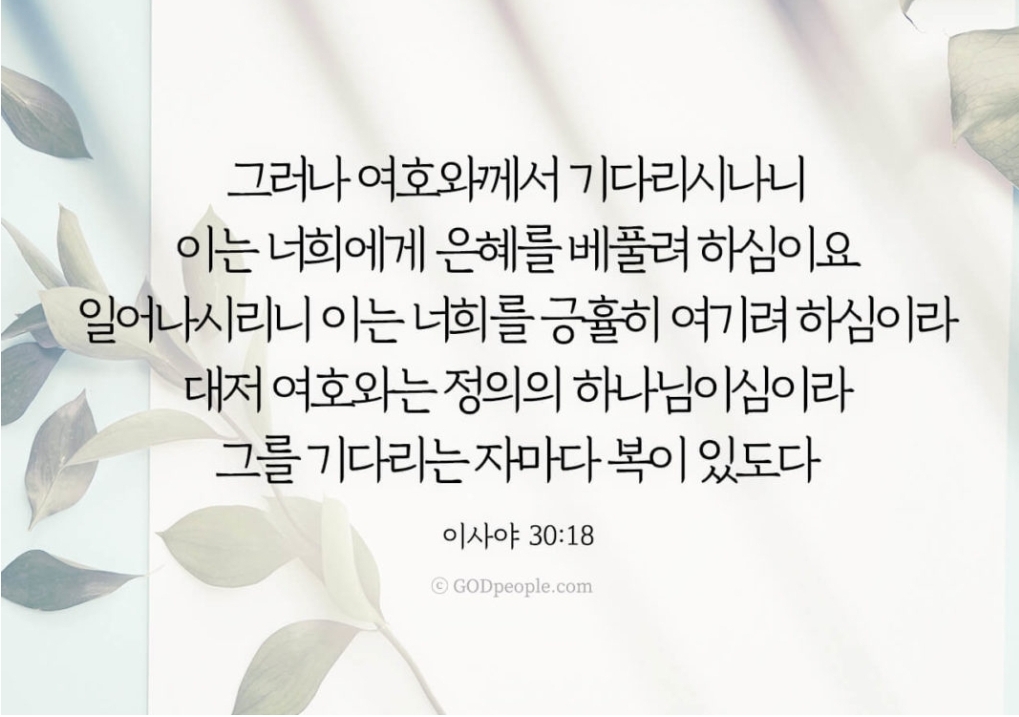 그러나 여호와께서 기다리시나니 이는 너희에게 은혜를 베풀려 하심이요 일어나시리니 이는 너희를 긍휼히 여기려 하심이라 대저 여호와는 정의의 하나님이심이라 그를 기다리는 자마다 복이 있도다 _이사야 30:18